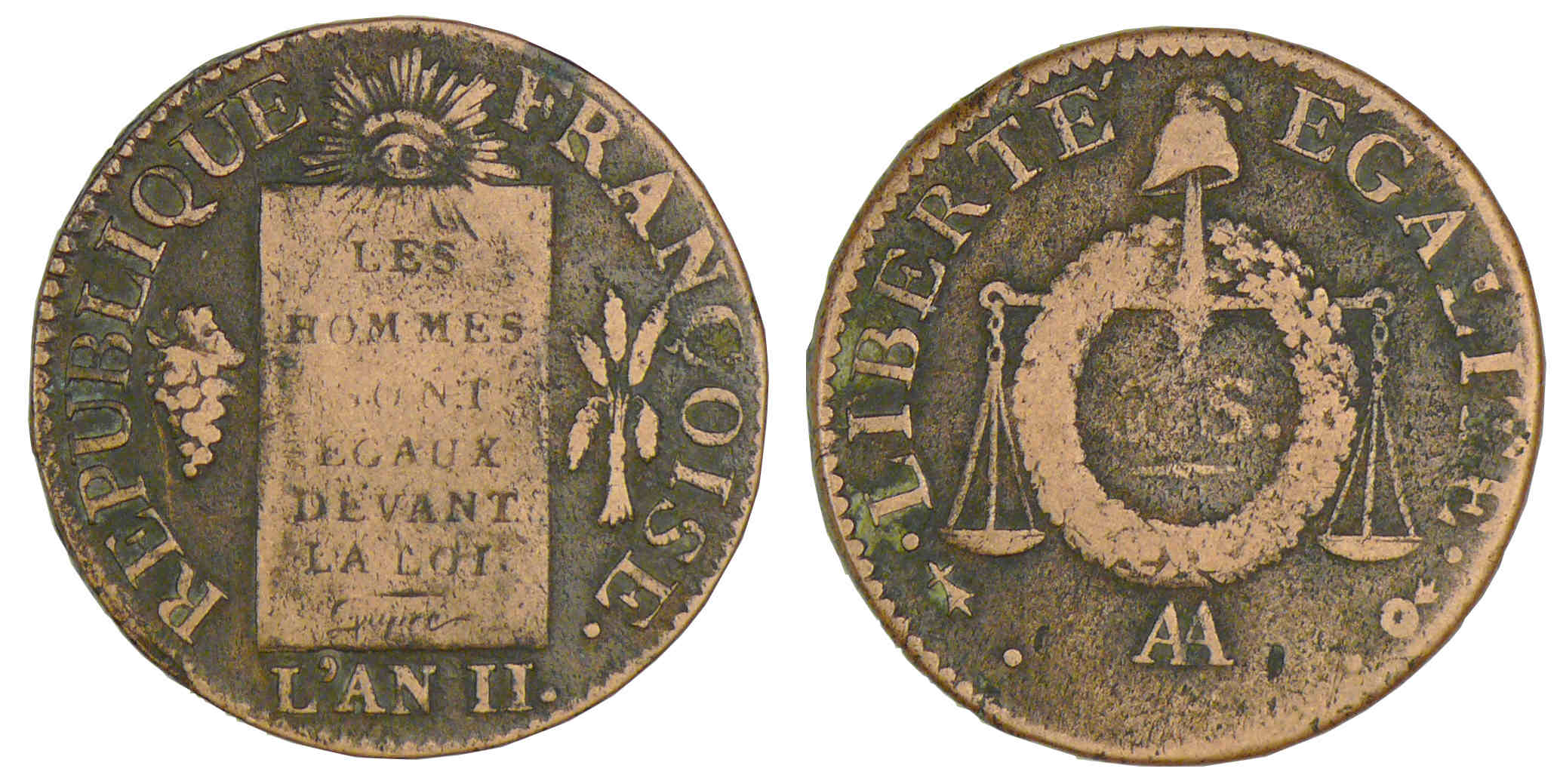 R/ LIBERTE – EGALITE . Balance sommée d’un bonnet phrygien à laquelle est appendue une couronne de chêne. Au centre 1.S.