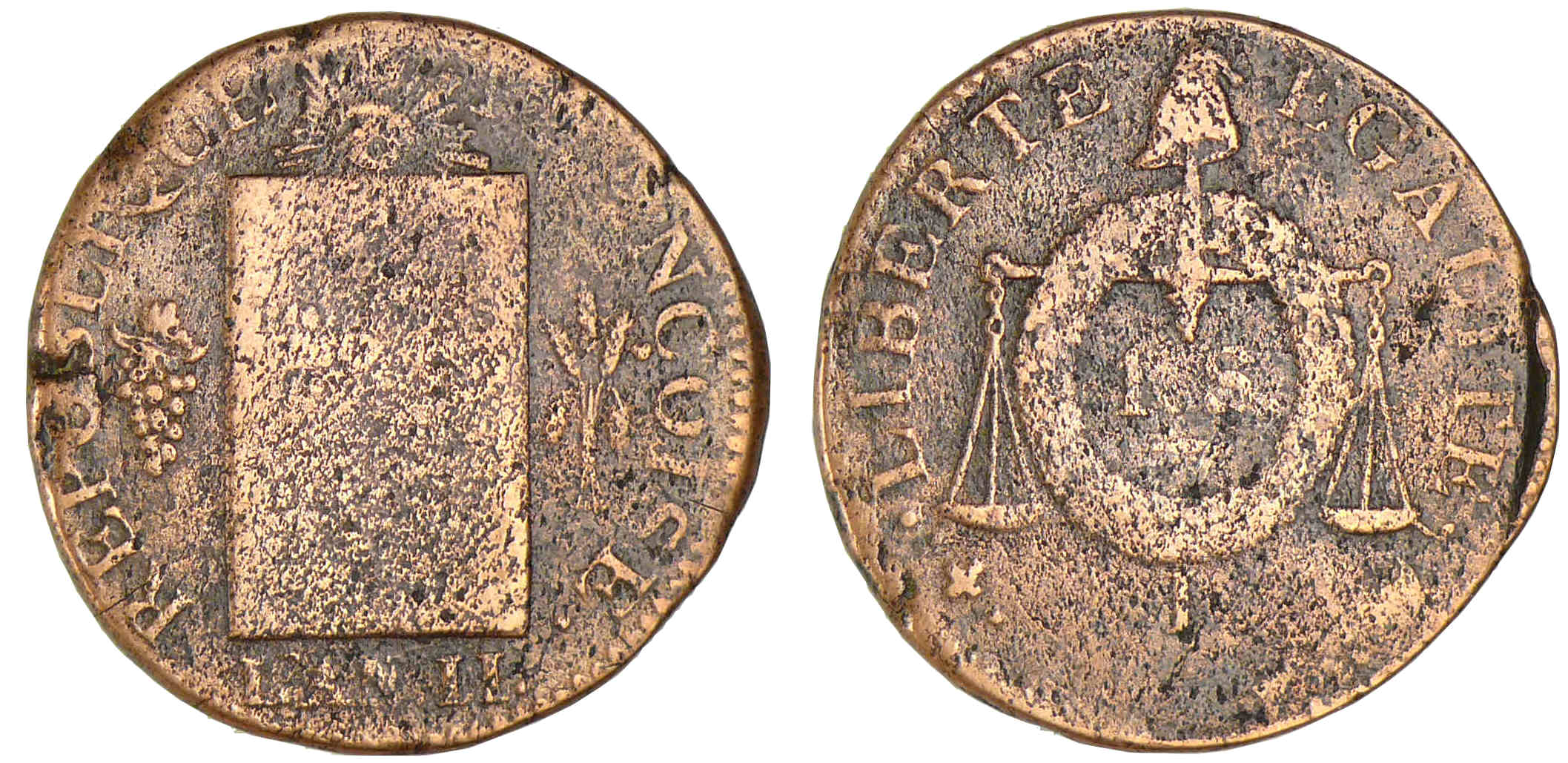 R/ LIBERTE – EGALITE (atelier). Balance sommée d’un bonnet phrygien à laquelle est appendue une couronne de chêne. Au centre 1.S.