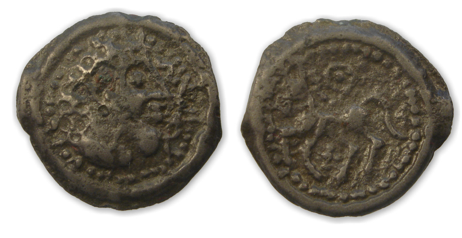 Revers : R/ Anépigraphe. Un cheval à gauche, la crinière perlée est enroulée au-dessus du cheval, une croix bouletée sous le cheval.