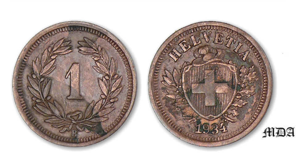 Suisse – 1 rappen 1934 B (Berne) frappe médaille