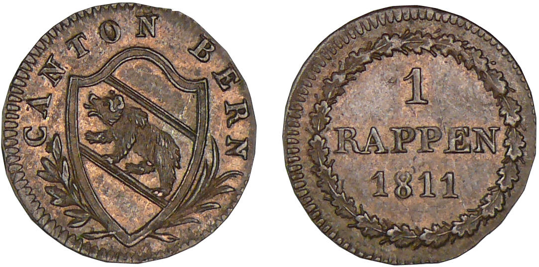 R/ 1 RAPPEN / (millésime) dans une couronne de chêne.