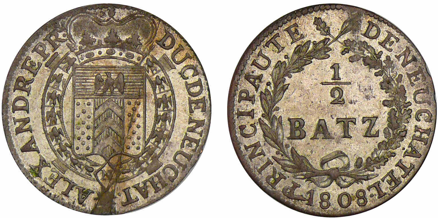 Suisse – Canton de Neuchatel – ½ batzen 2ème type – 1808 (Neuchatel)
