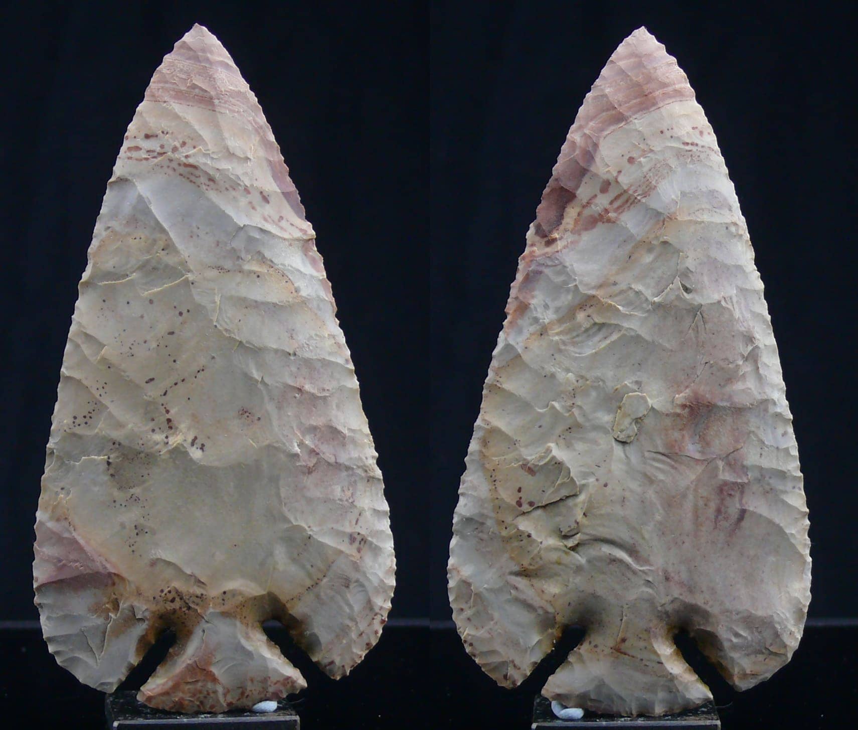 Pointe triangulaire à encoches en coins obliques en silex beige. Dimensions : 110*58 mm.