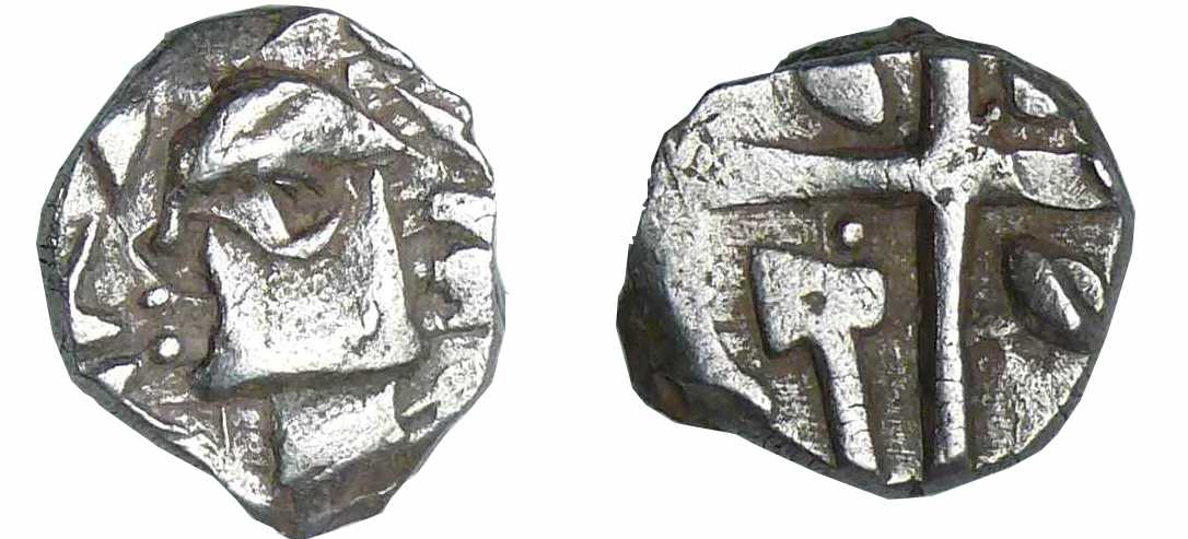 A/ Anépigraphe. Tête stylisée à gauche avec la chevelure sous forme de mèches ovoïdes. Devant le visage, deux dauphins.