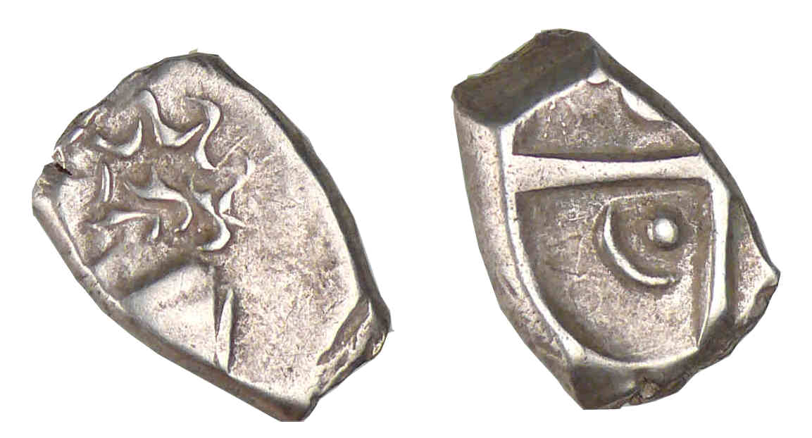 Avers : A/ Anépigraphe. Tête stylisée à gauche avec la chevelure sous forme de mèches ovoïdes. Devant le visage, deux dauphins.