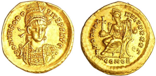 Revers : R/ VOT XXX MVLT XXXXΓ -|* // CONOB. Constantinople assise à gauche, les jambes croisées, le pied droit sur la proue d’un navire, tenant un globle crucigère et un sceptre.