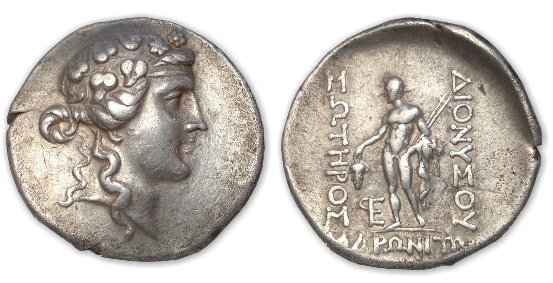 R/ ΔΙΟΝΥΣΟΥ / ΣΩΤΗΡΟΣ / ΜΑΡΩΝΙΤΩΝ / monogramme. Dionysos nu debout à gauche tenant une grappe de raisin, sa chlamyde et deux baguettes.