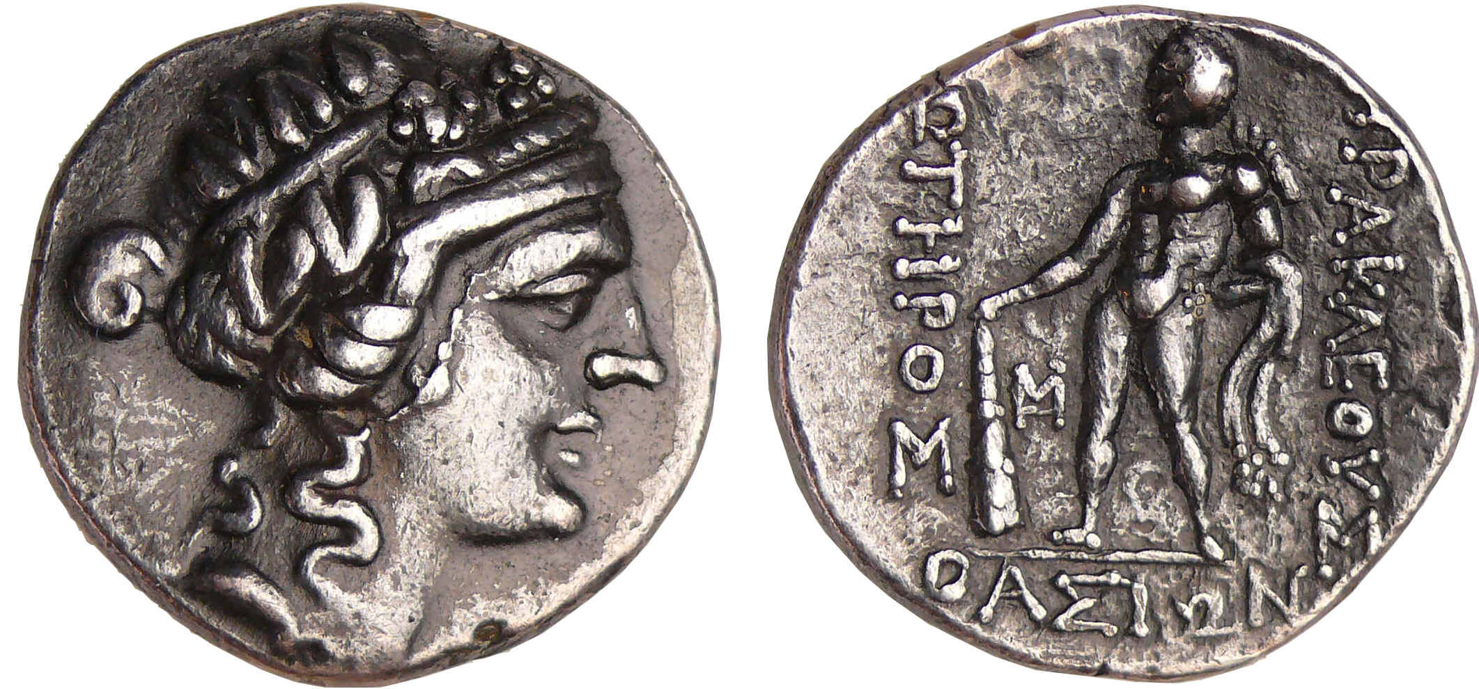 Avers : A/ Tête de Dionysos à droite.