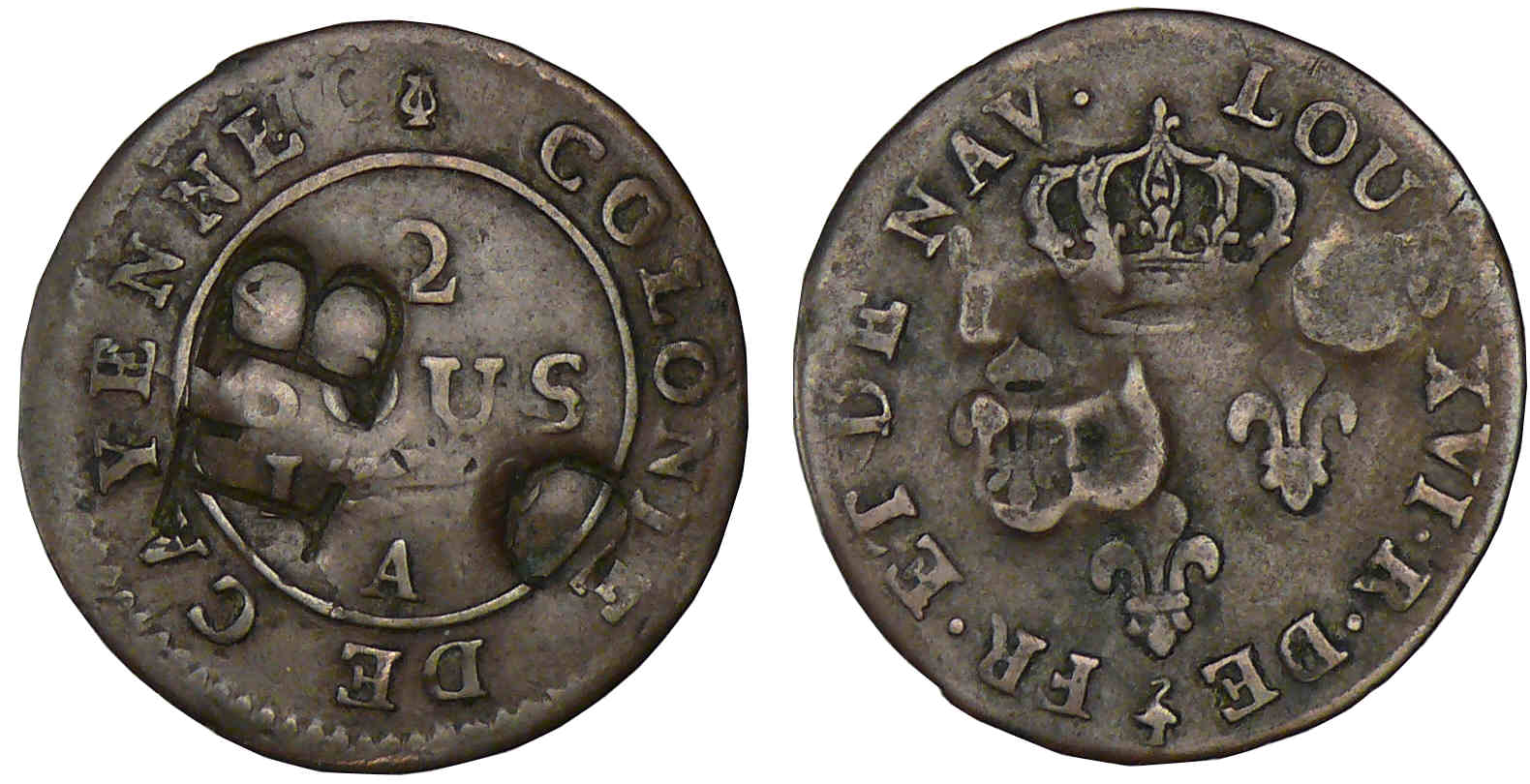 / Tobago – Sou marqué avec contremarque sur une 2 sous de Cayenne