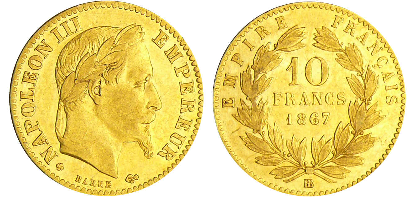 Napoléon III (1852-1870) – 10 francs tête laurée 1867 BB (Strasbourg) petit BB