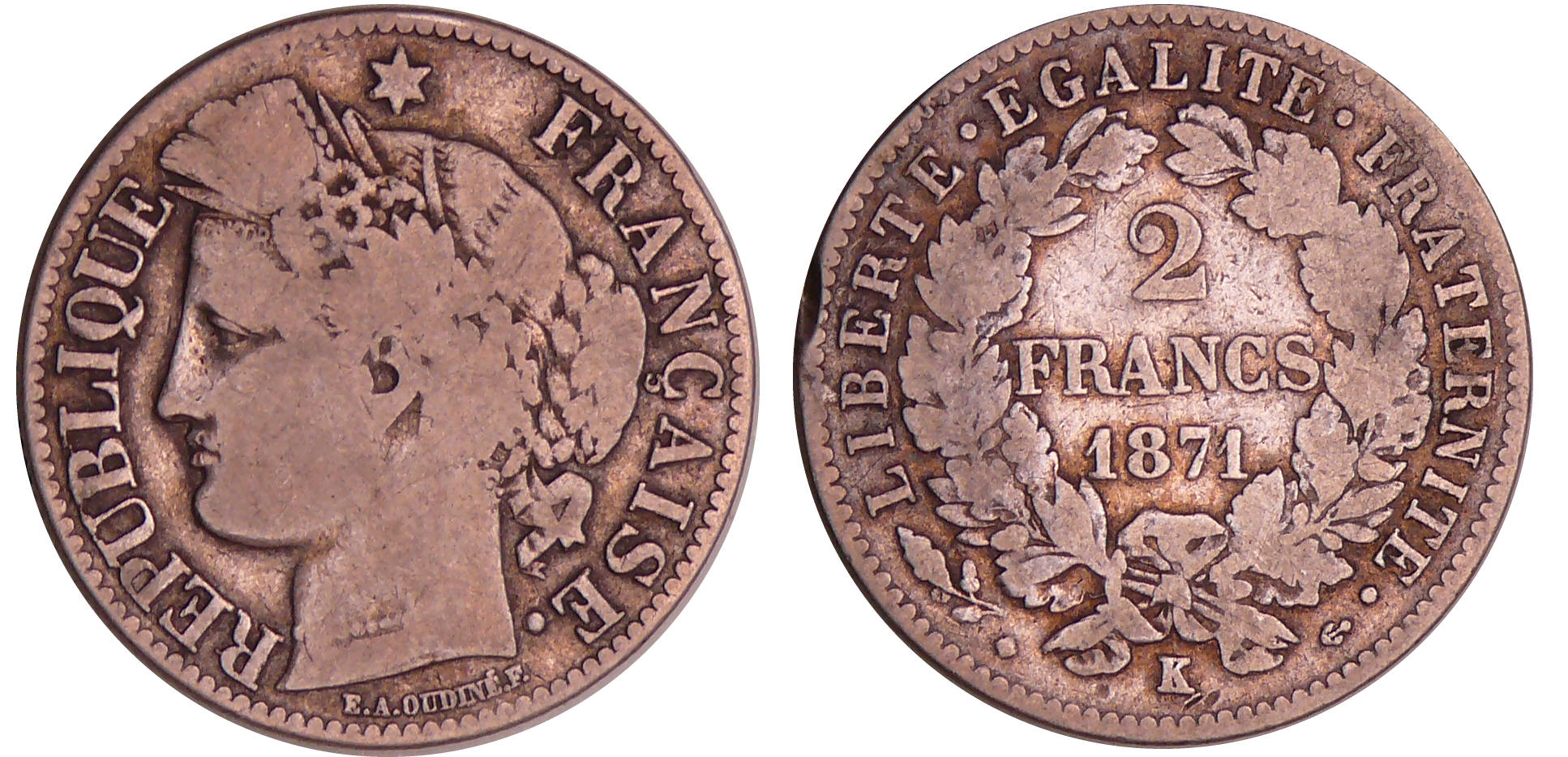 Troisième république (1871-1940) – 2 francs Cérès avec légende 1871 K (Bordeaux) grand K