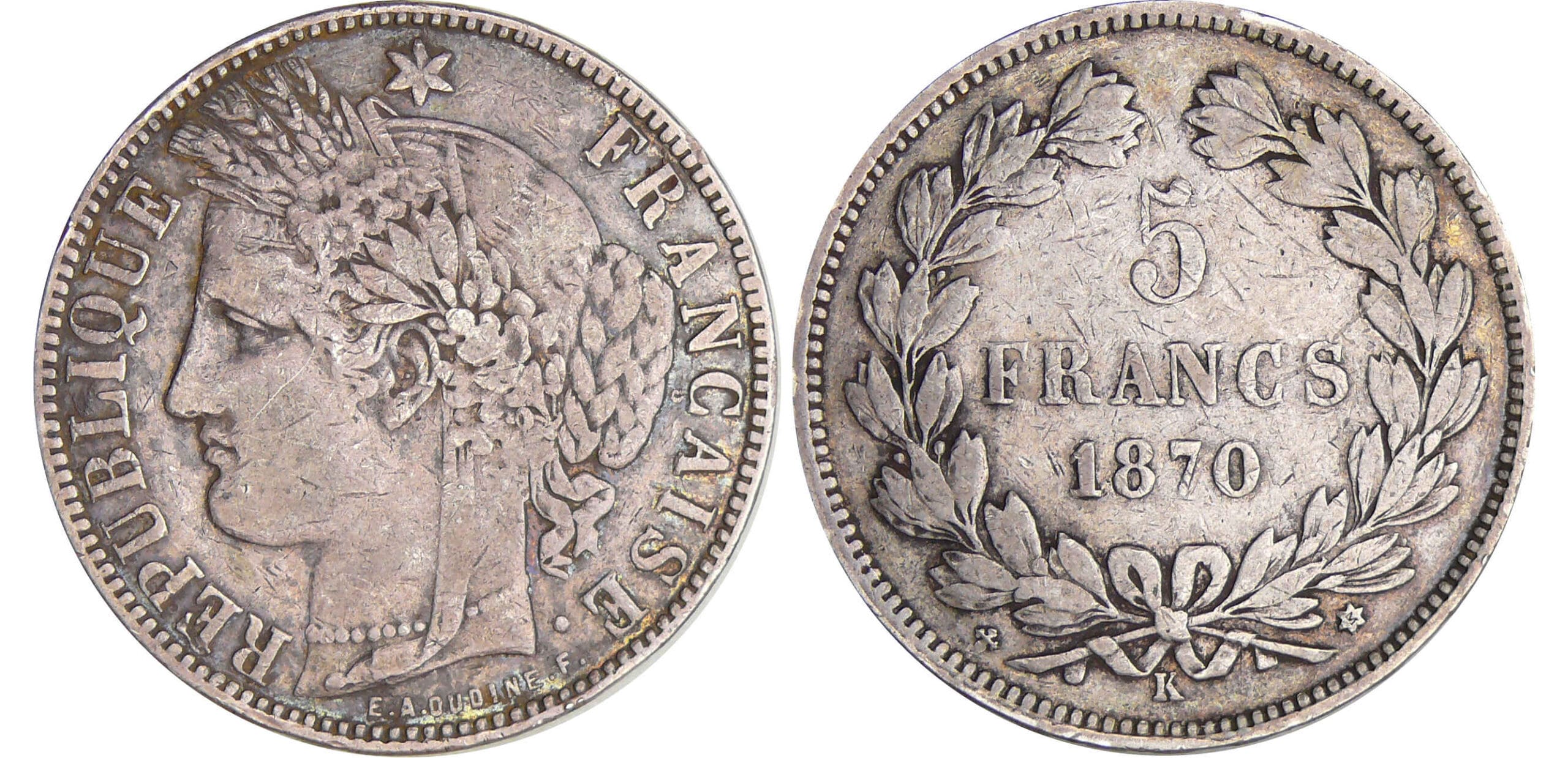 / Gouvernement de défense nationale (1870-1871) – 5 francs Cérès sans légende 1870 K (Bordeaux) M à 2 heures