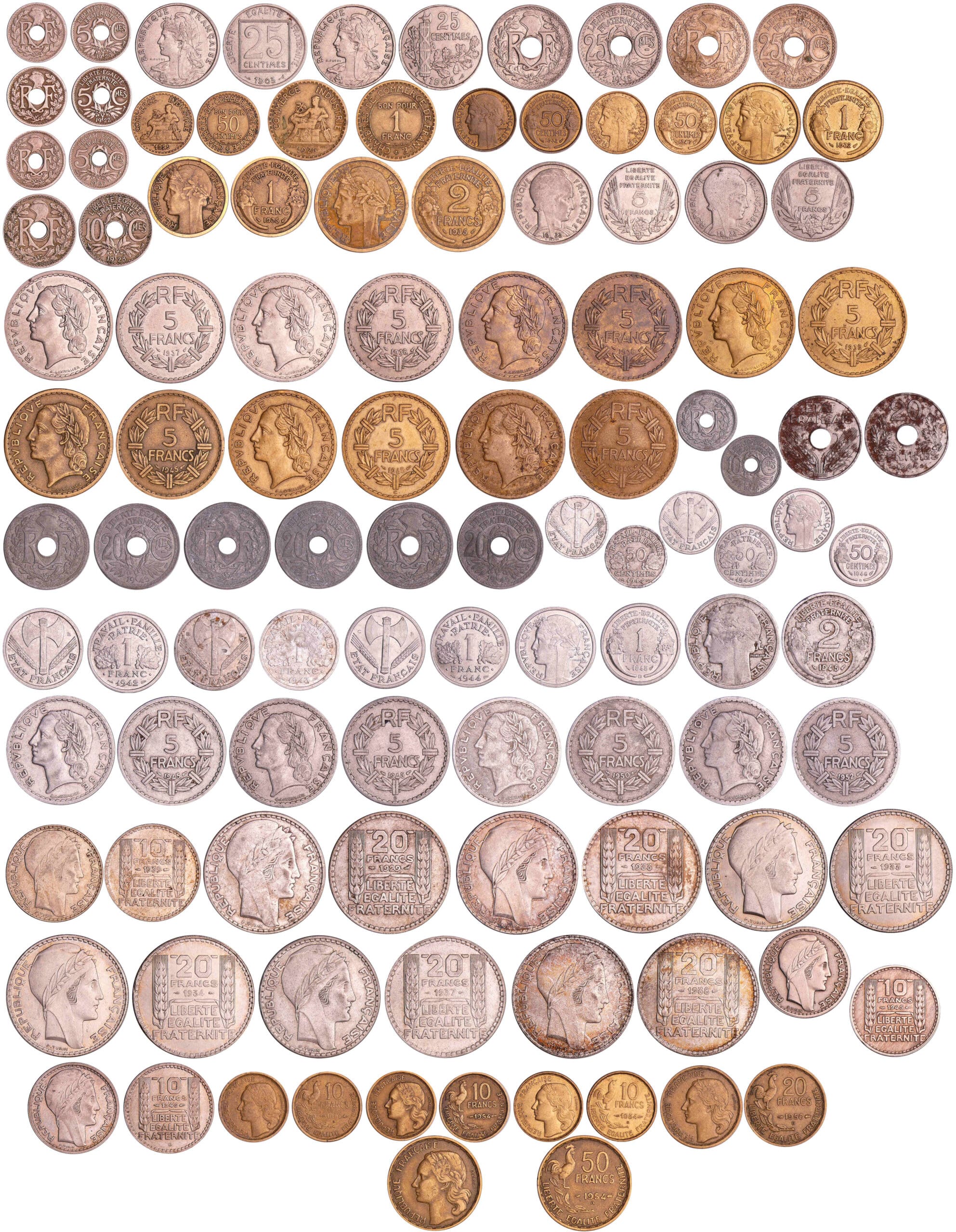 Troisième république (1871-1940) et Quatrième république (1947-1959) – Lot de 55 monnaies