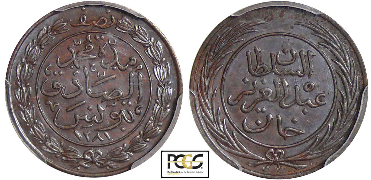 Tunisie – Abdul Aziz (1860-1876) – Flan bruni 1/2 kharub AH1281 (1865)