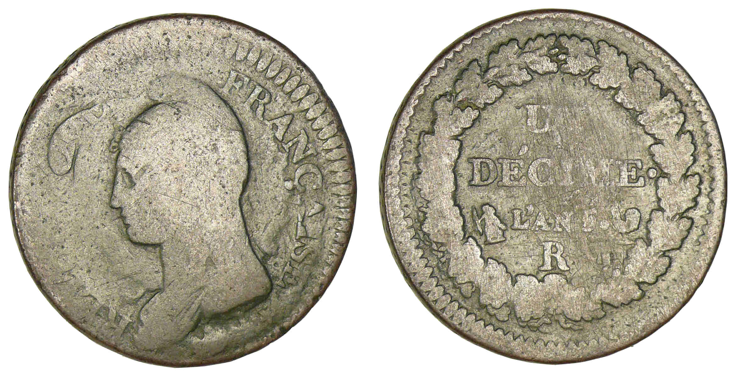 R/ UN / DÉCIME. / (millésime). / (atelier) dans une couronne de chêne.