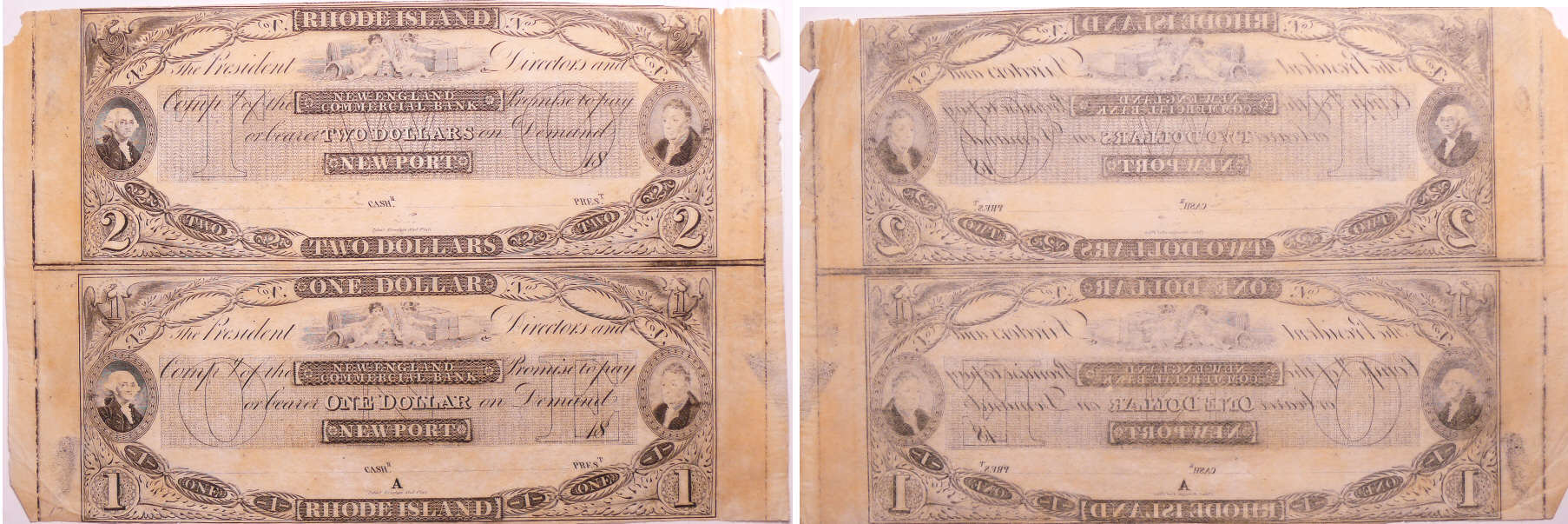 United States – Obsolete currency – Rhode Island (Newport), New England Commercial Bank – planche de 1 et 2 dollars 18–