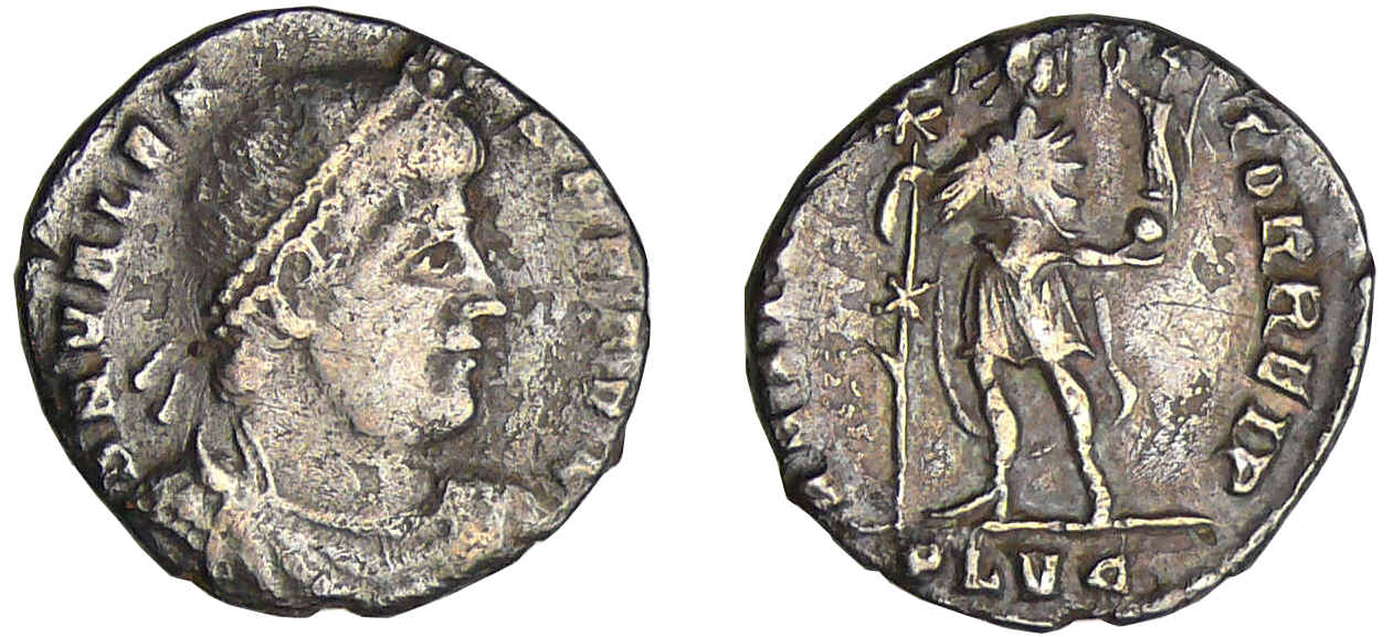 R/ RESTITVTOR REIP // SLVG°. Valens en habits militaires, debout, regardant à droite et tenant le labarum et une Victoire sur un globe.