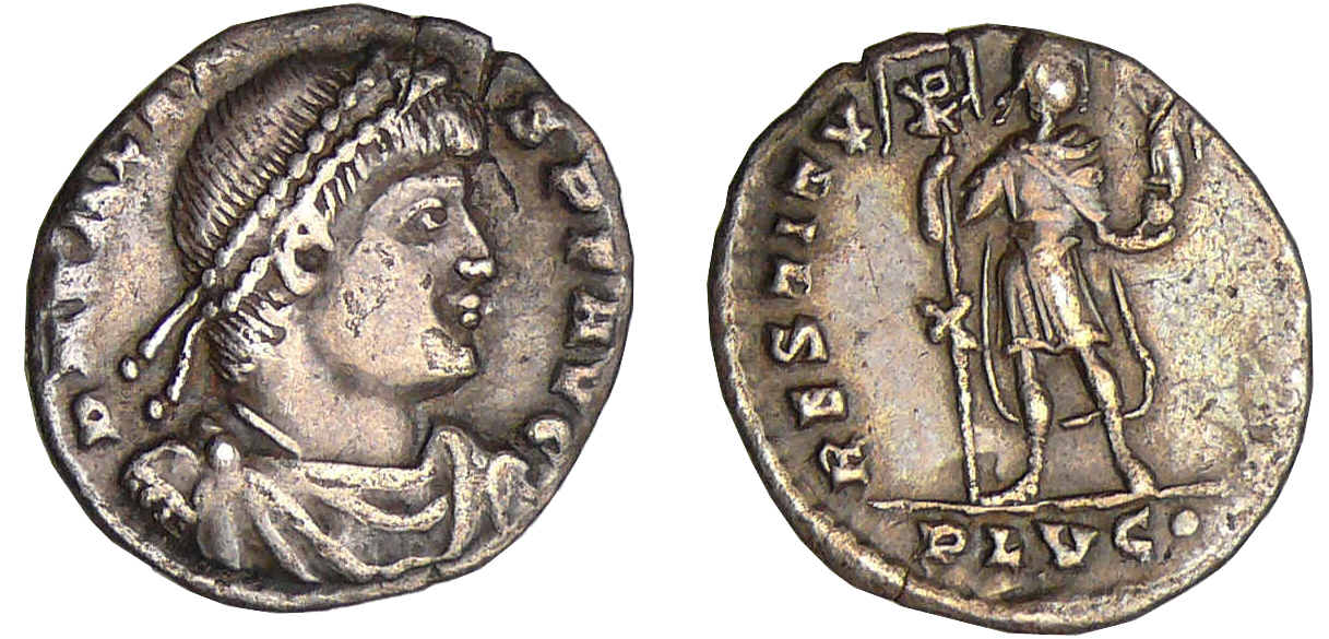 R/ RESTITVTOR REIP // SLVG°. Valens en habits militaires, debout, regardant à droite et tenant le labarum et une Victoire sur un globe.
