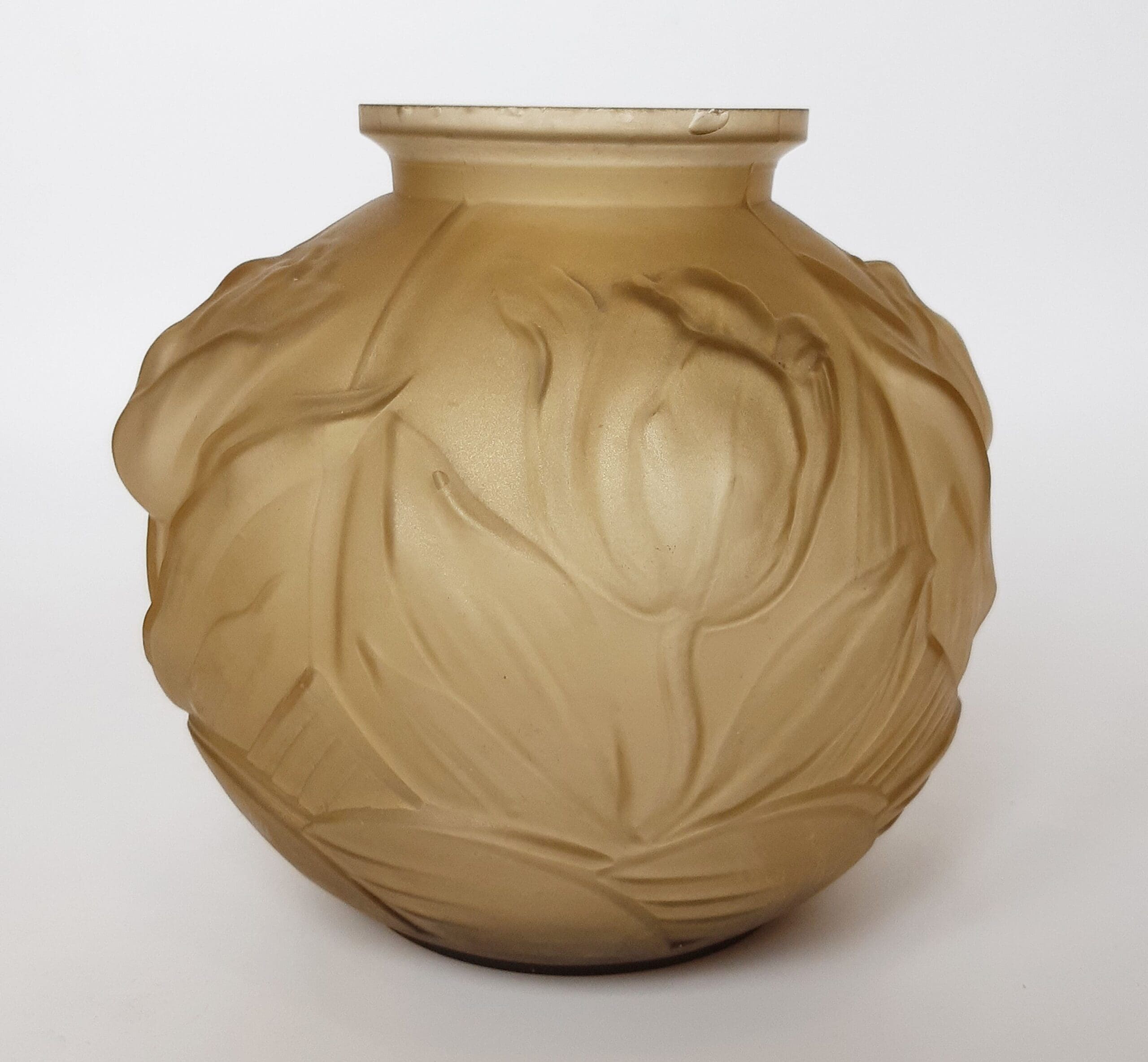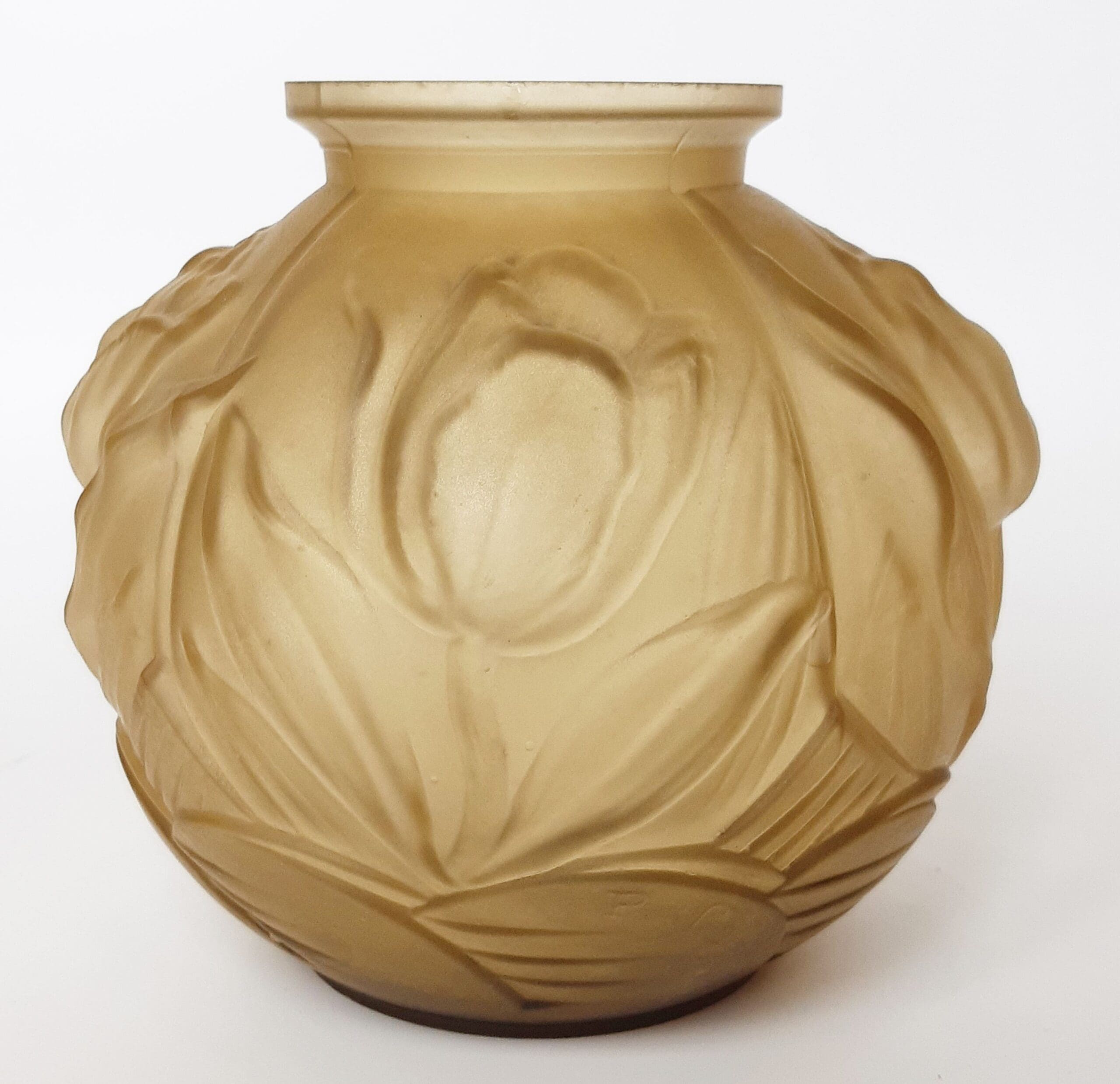 Avers : Joli vase boule période Art Déco en verre moulé de couleur jaune, à motif de tulipes et col court et évasé. Un petit éclat sur le bord du col. Vase signé P. CAGNY à la base d’une tulipe. 17 cm.