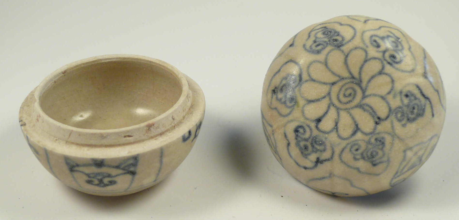 Avers : Boite à parfum recouverte d’une glaçure blanche et bleue – couvercle décoré de motifs floraux – 5.4 cm de diamètre et 3.9 cm de hauteur – Pièce provenant de l’épave Hoï An. certificat 51603.